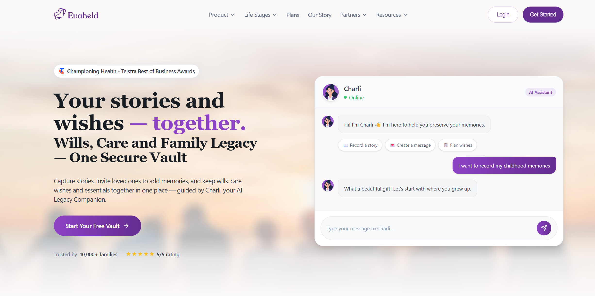 Evaheld is an Australian platform that does something genuinely unique: it merges legal/medical end-of-life planning with personal legacy preservation. You can store your will, advance care directives, and important documents alongside family stories, scheduled future messages (delivered to loved ones after you're gone or on future milestones), and an AI companion called "Charli" that guides you through conversational prompts.